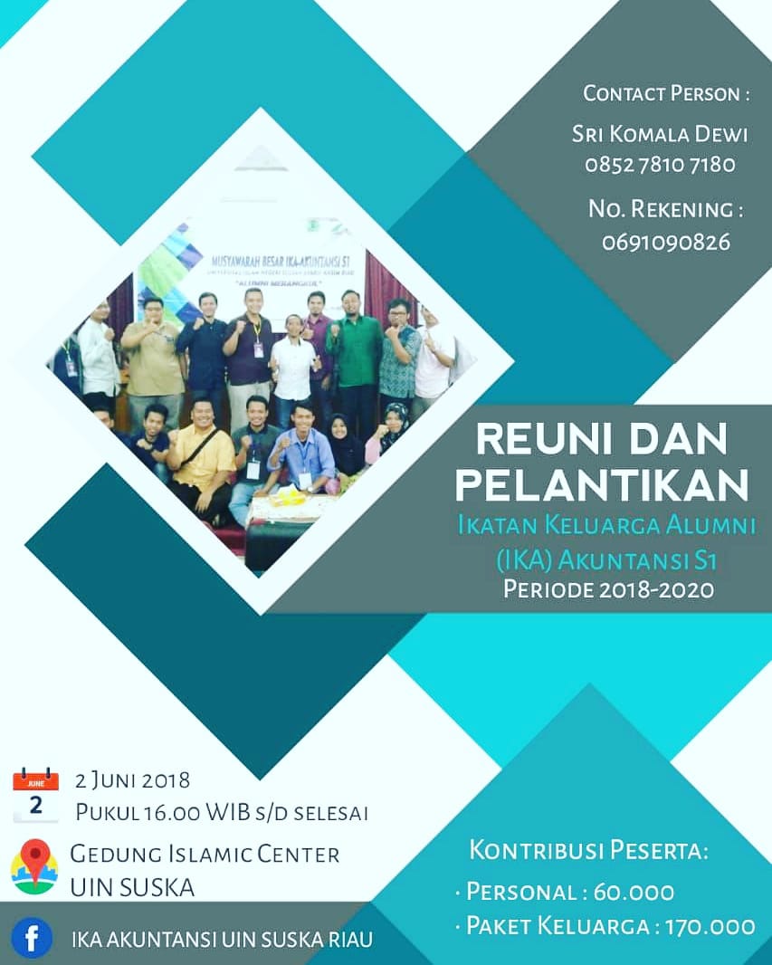INHILKLIK.COM, PEKANBARU - Pengurus Ikatan Keluarga Alumni – Akuntansi S1 Fakultas Ekonomi dan Ilmu Sosial Universitas Islam Negeri Sultan Syarif Kasim Riau ( IKA Ak S1 Fekonsos UIN Suska Riau) akan menggelar acara buka puasa bersama dan reuni alumni Akuntansi S1 Fekonsos UIN Suska Riau. Adapun perhelatan ini juga berkaitan dengan akan diselenggarakannya pelantikan pengurus IKA Ak S1 Fekonsos UIN Suska Riau periode ke 2 (dua) tahun 2018 – 2020.