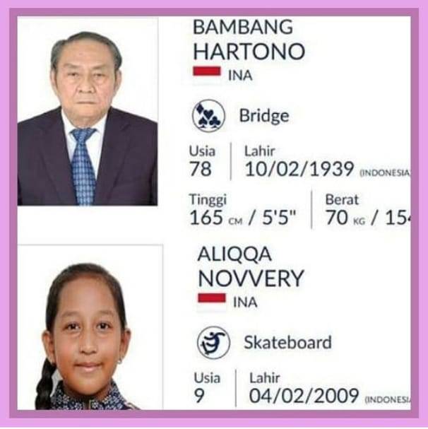 Sedangkan Aliqqa Novvery tercatat sebagai atlet yang paling muda yang akan membela Indonesia di ajang Asian Games edisi ke-18 itu. Gadis belia kelahiran 2009 sembilan itu akan bertanding di cabor Skateboard.
