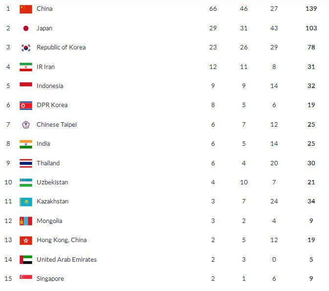 Sementara, itu, posisi puncak klasemen masih jadi milik China. Sejauh ini, China melaju pesat dengan meraih 139 medali dengan rincian 66 emas, 45 perak dan 27 perunggu. Berikut adalah klasemen Asian Games 2018 lengkapnya: