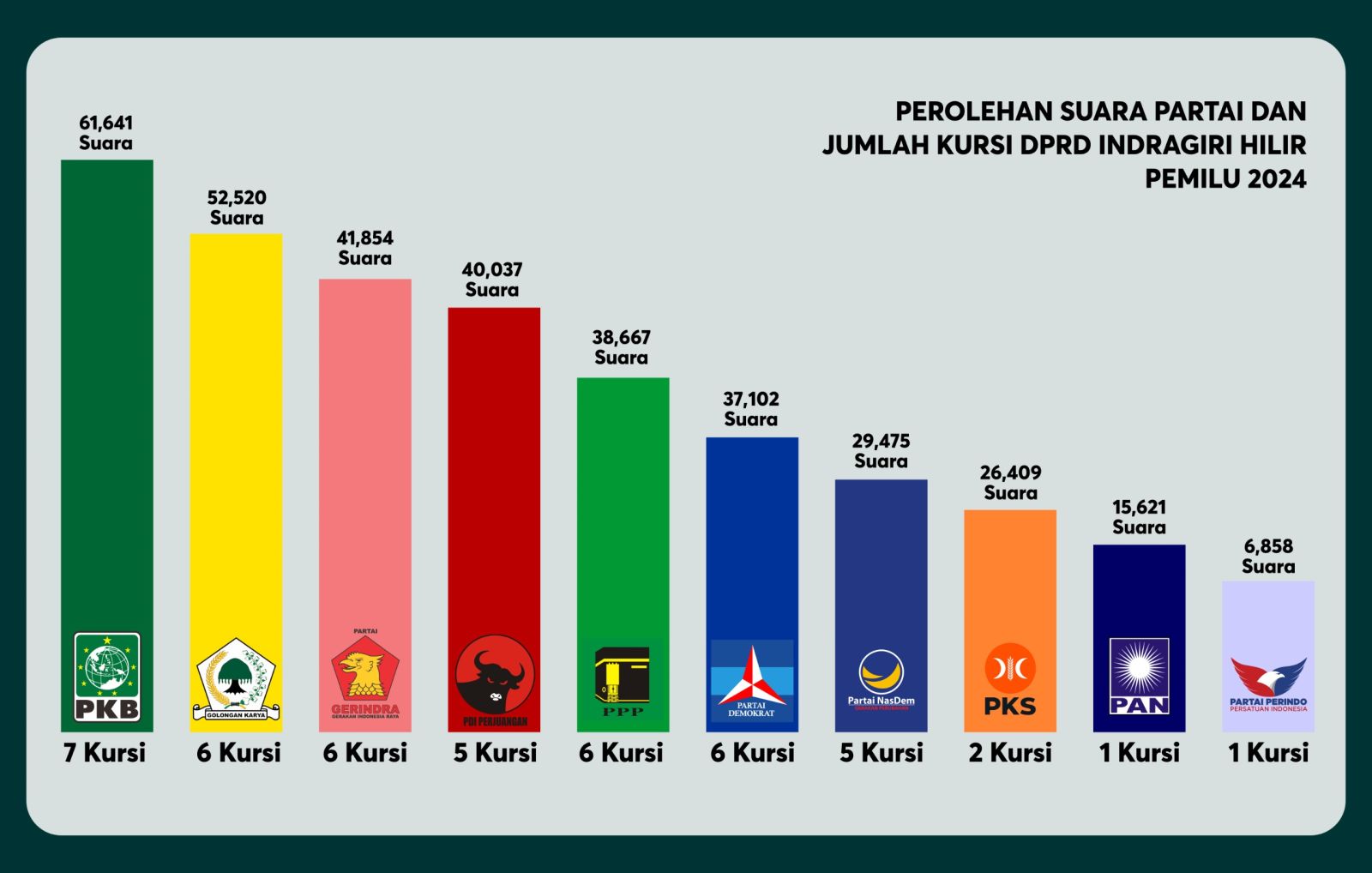 "Berdasarkan data raihan suara terbanyak ini, PKB Inhil keluar sebagai pemenang dengan suara terbanyak 61.641," jelasnya lagi.